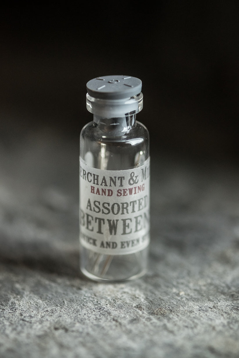 A mixture of 12 slightly different sizes encased in a Merchant & Mills glass vial with rubber stopper - perfect for travelling and would make a most excellent gift.